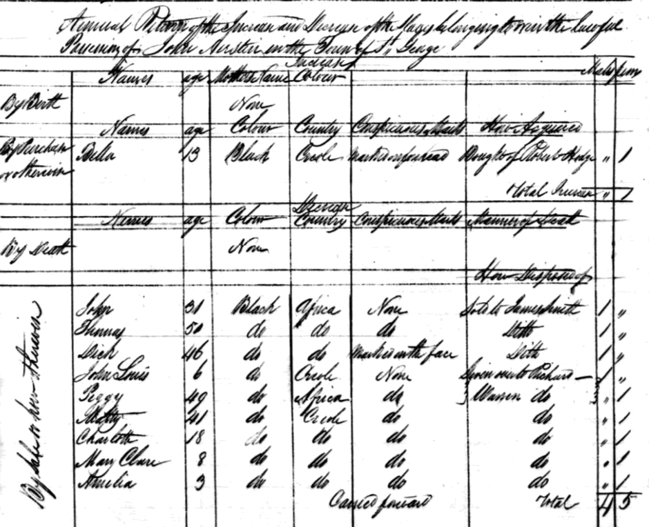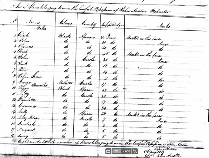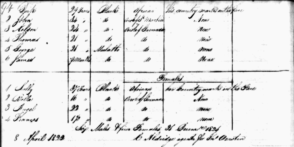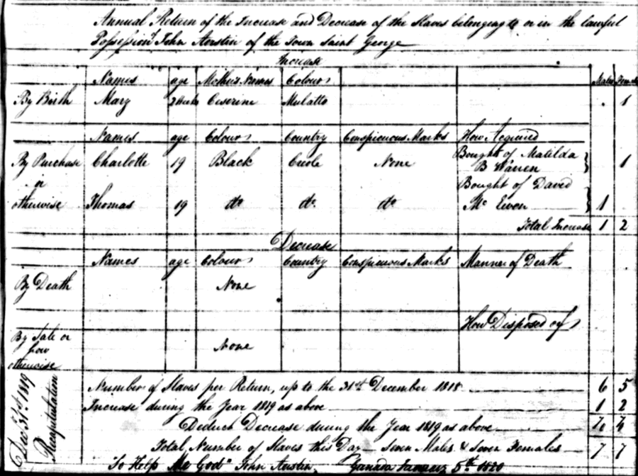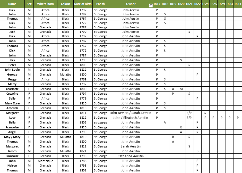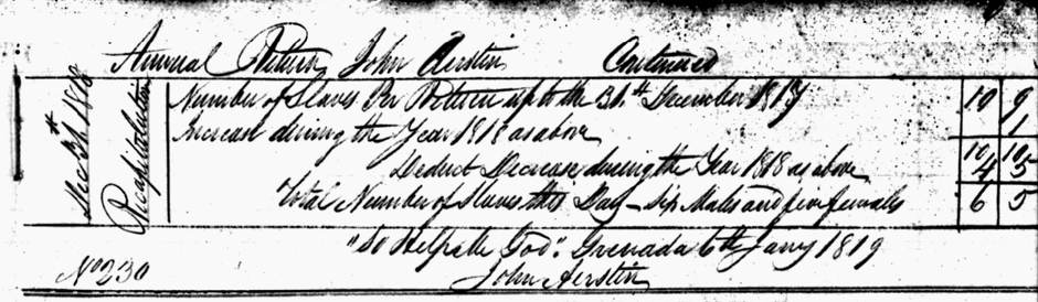 John Aerstin emerges as the central figure in the family’s history in early-19th-century Grenada. In 1817 he was based in St George that held eighteen enslaved people.