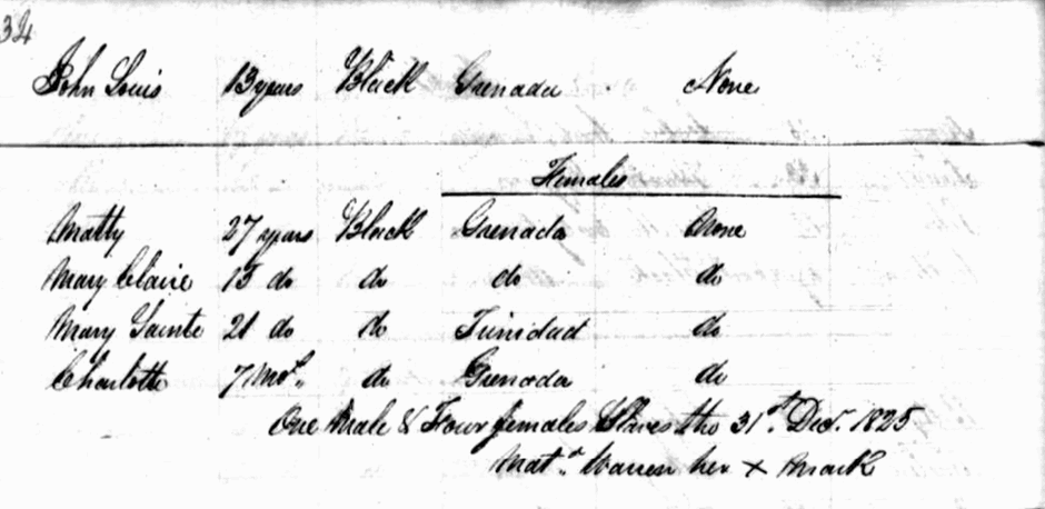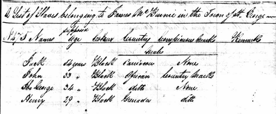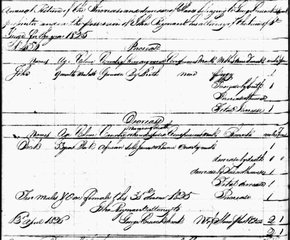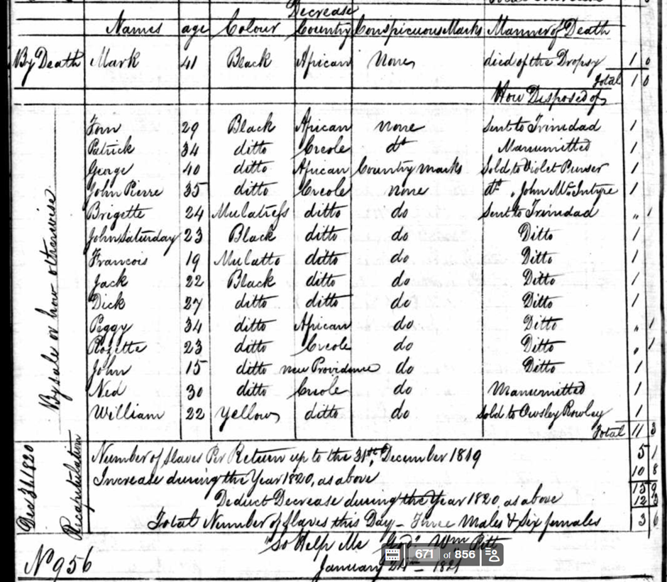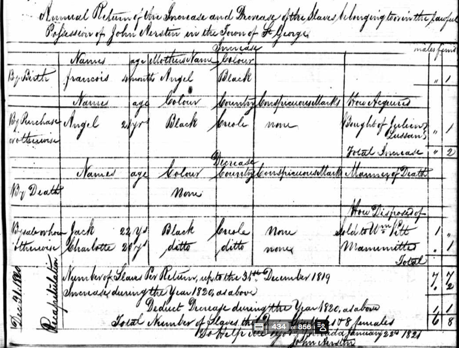 In the 1820 Slave Register, John had 14 enslaved people under his control (6 male, 8 female). He made the following changes. He sold Jack (22) to William Pitt and manumitted Charlotte (20). He bought Angel (21) who gave birth to a daughter Francoise.