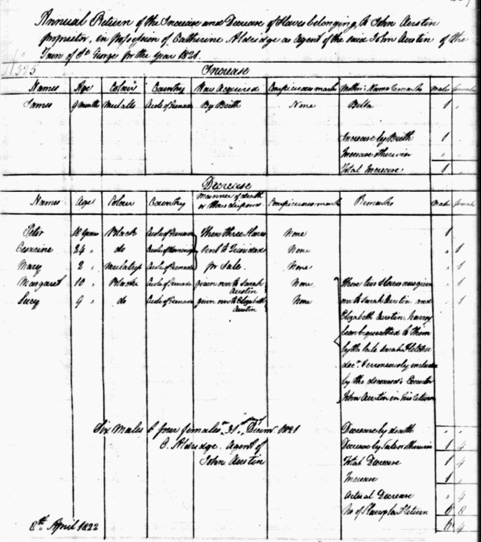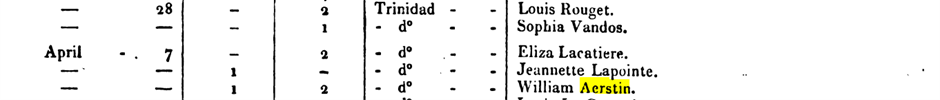 William Aerstin appears briefly but significantly. On 7 April 1821 he exported three enslaved people; two females and one male, from Grenada to Trinidad. These individuals may have been the same Peter, Cesarine, and her daughter May who had been enslaved by John Aerstin and were removed around the same period. His actions suggest that William participated directly in the inter-Caribbean slave trade.