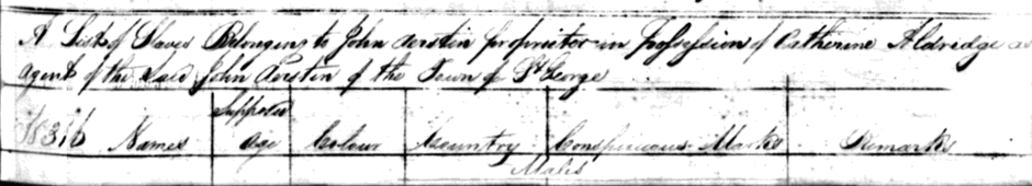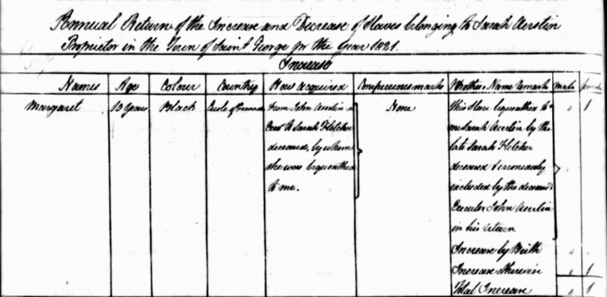Sarah AERSTIN was also included in the 1821 register. She is listed as the owner of Margaret, a ten-year-old bequeathed to her by the late Sarah Fletcher under the same executor, John Aerstin, like Elizabeth. Sarah’s small-scale ownership resembles Elizabeth’s.