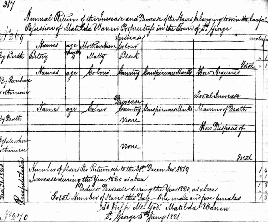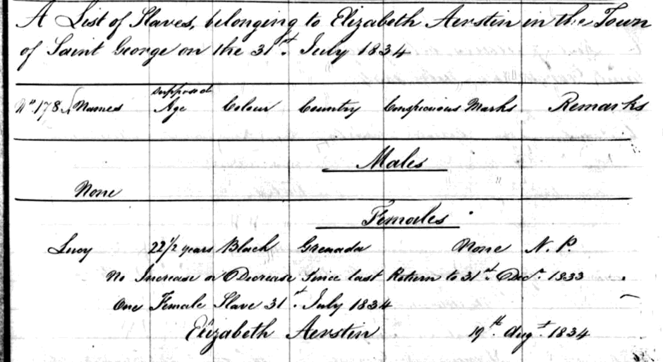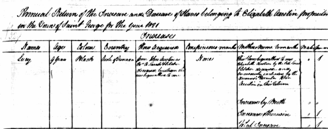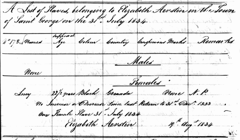 Elizabeth comes into focus through the 1821 Slave Register, when she appears as the owner of Lucy, who had been bequeathed to her by the late Sarah Fletcher. The record reads “This Slave bequeathed to me Sarah Aerstin by the late Sarah Fletcher deceased & commonly included by the deceased’s Executor John Aerstin in his return”