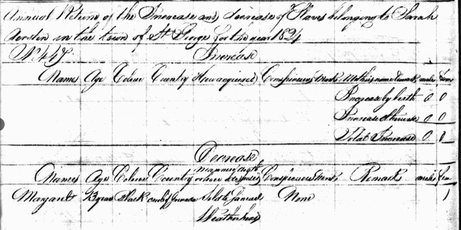 By 1824 she had sold Margaret, then aged thirteen, to Samuel Weatherhead. She held one other female enslaved person at that time, though no further details are recorded. After 1824, Sarah disappears from the registers entirely. Whether she died, migrated, married under a different surname, or simply ceased to own enslaved people remains unknown.