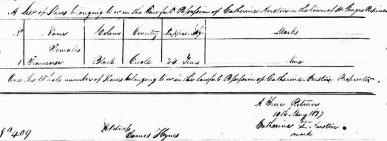 Catherine enters the historical record in 1817 as the enslaver of a woman named Francoise in St George. Her involvement appears minimal, and it is unclear how she connects to John or the others. She may have been a relative, wife, or widow, or simply part of a wider Aerstin network in the parish.