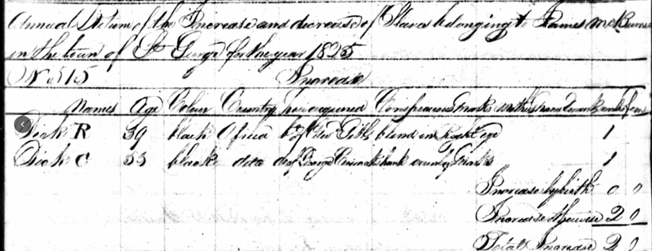 Dick appears in James McBurnie’s 1825 register, age 59. Now known as Dick C as there was another Dick in the register. There was an African John listed too but the dates don’t match the one we are following and the country marks would be a change from the earlier records – but we saw this change with Dick. This was the last we saw of Dick.