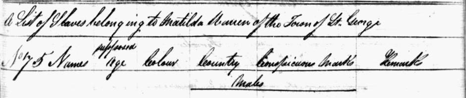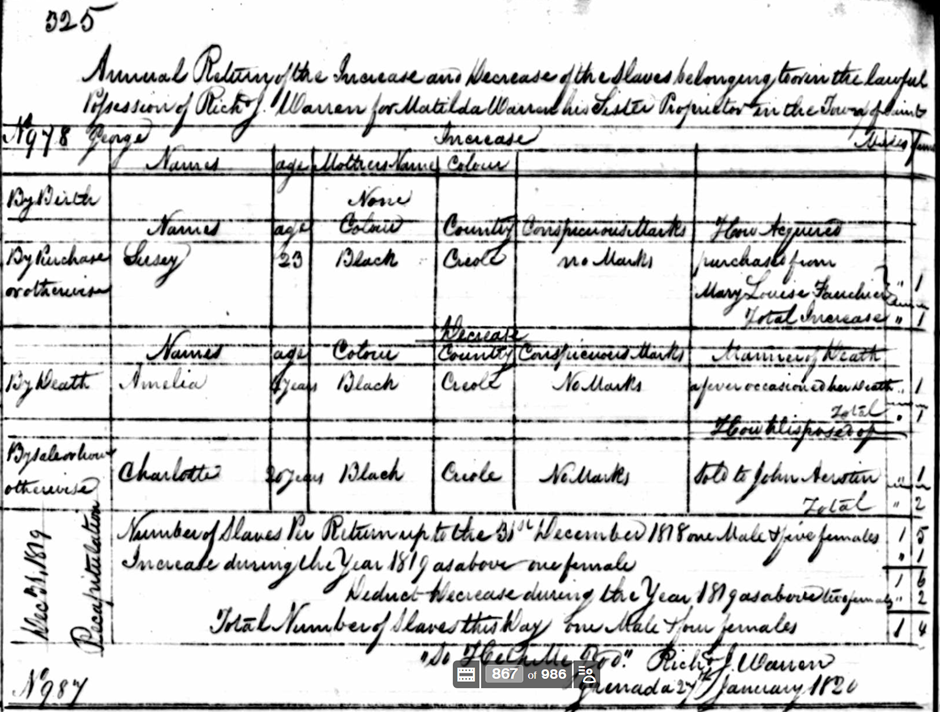 Richard Warren’s slave register for 1819 tells us more. Richard was the legal owner but they were for his sister Matilda Warren who was a business owner in St George. He recorded Amelia’s death that year, age 47 from a fever. He also sold Charlotte (20) to John Aerstin.