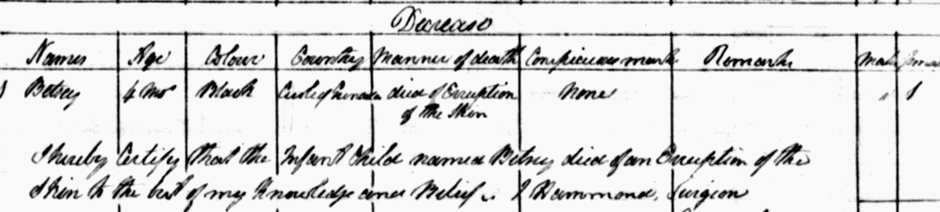 Unfortunately, Betsey died in infancy aged 4 months. The record says that she died from eruption of the skin which was a term used to describe a range of issues including ulceration, yaws (a common chronic infectious disease) or even smallpox. As enslaved people had limited access to medical treatment, a mild skin eruption could become life-threatening through infection, fever or septicaemia.