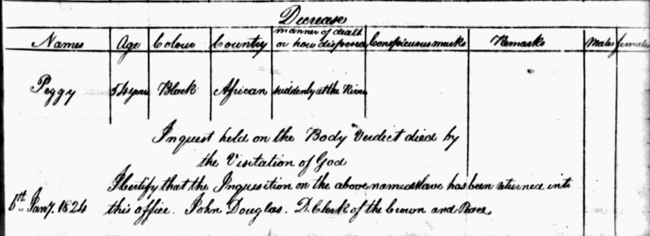 Sadly, Peggy died in 1823. An inquest concluded that she had died by the virtuation of God which really meant she passed by natural causes, at 54 years old. The inquest may have been called for because of the suddenness of her passing. The Amelioration Act that was passed in 1823 required such an inquest if a death had been sudden, suspicious or resulting from severe punishment. The act was passed as the British government were facing huge pressures from abolitionists and wanted the system to appear more humane and reassure Parliament that the system was being reformed. A coroner would be appointed and a white jury. Even if the death had been as a result of brutal treatment, the enslaved witnesses were not allowed to testify and prosecutions of the perpetrators were almost non-existent.