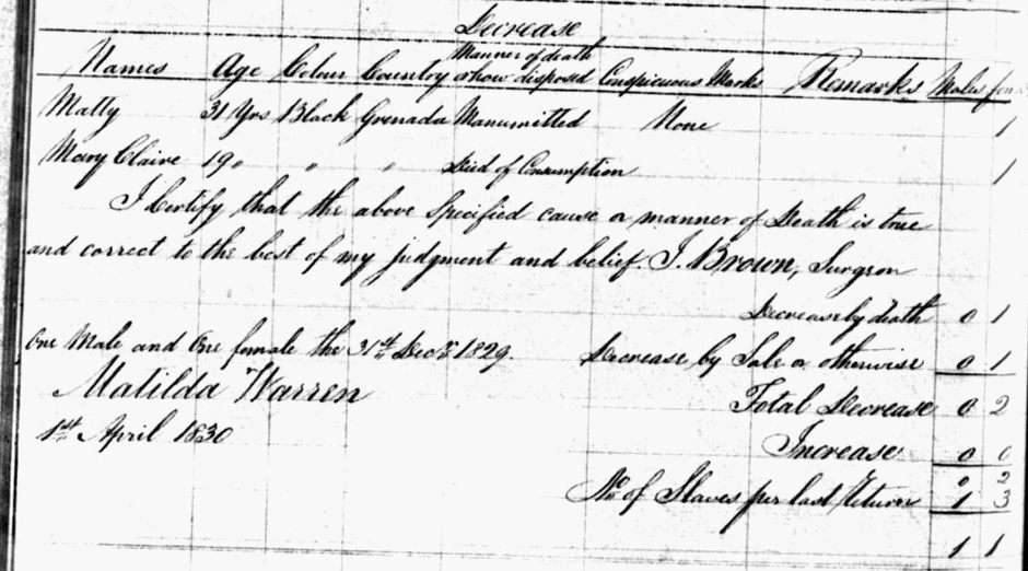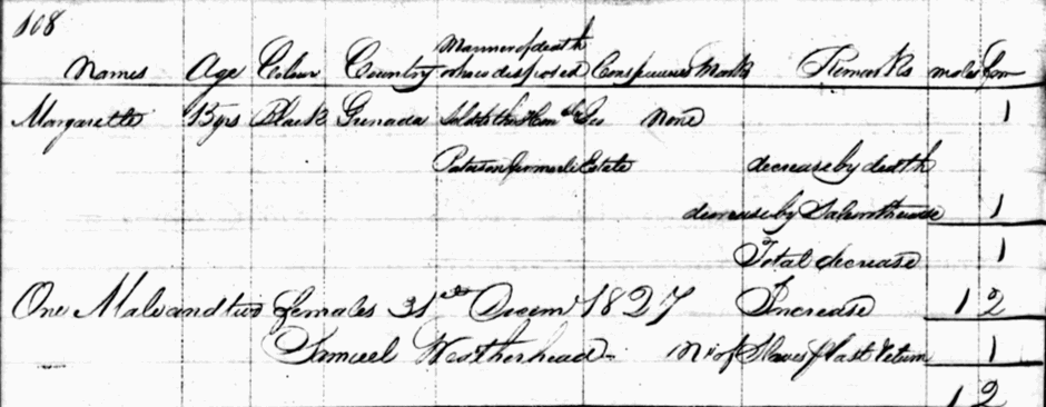 The 1821 Slave Register shows that he had placed his interests under the possession of Catherine Aldridge.