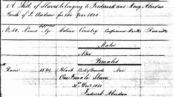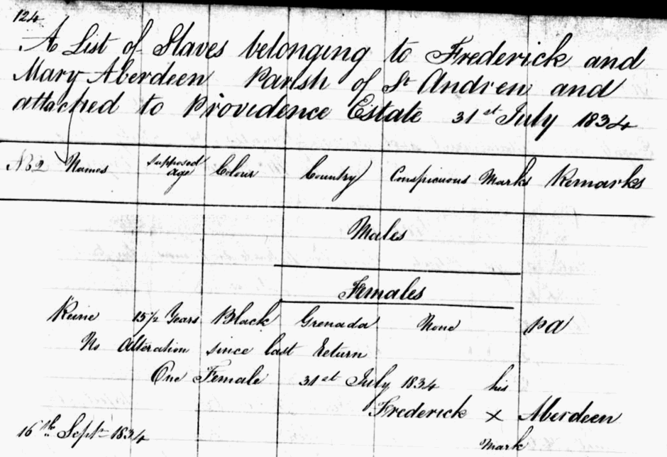 The 1833 slave register shows that Frederick and Mary Aberdeen had one enslaved a girl named Reine. Reine was born in Grenada and lived on the Providence Estate in St. Andrew, where she was probably born.
