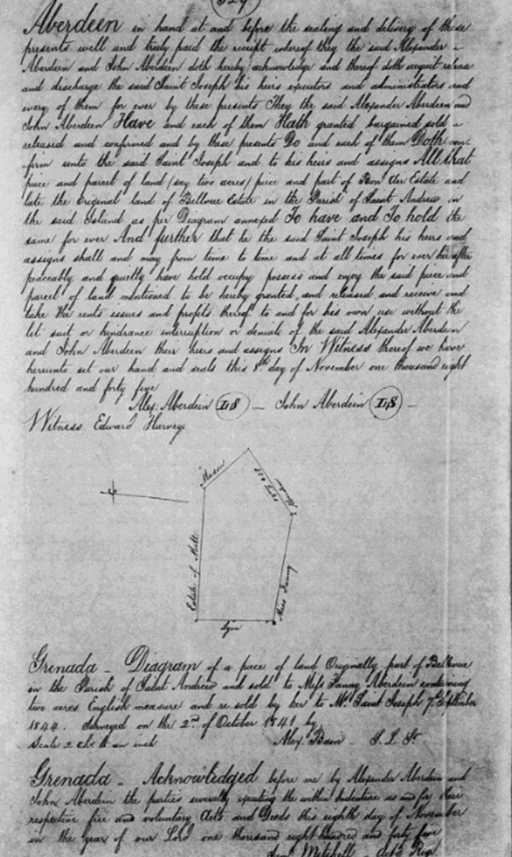 It refers to forty-two acres, originally part of the Bellona Estate in the St. Andrew. A survey diagram was included in the original document. The indenture formally grants, sells, releases and confirms the land to Saint Joseph and guarantees that he and his heirs may hold, occupy and enjoy it permanently without interruption or dispute. The document is signed and sealed by Alexander and John Aberdeen and witnessed by Edward Harvey.Alexander Aberdeen’s children