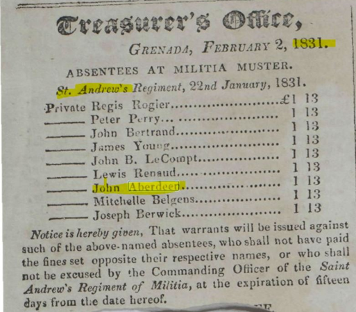 The earliest known reference to John Aberdeen appears in the Grenada Free Press of 2 February 1831. He is listed under the St Andrew’s Regiment of Militia as an absentee from muster. It should be noted that militia rolls were poorly attended across the Caribbean, and absences were frequent. Names appeared repeatedly in these lists without any consequence to a man’s social status, employment prospects, or respectability.