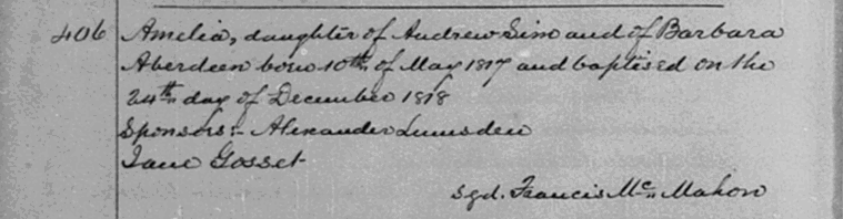 An 1818 baptismal record dated lists Amelia Sim, daughter of Andrew Sim and Barbara Aberdeen. She was born on 10 May 1817 and baptized on 24 December 1818 in St George’s. Ref