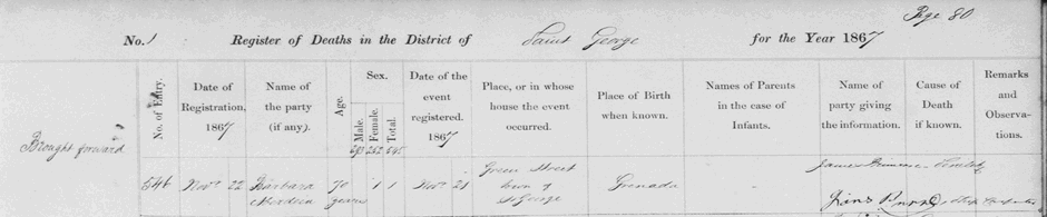 His death was reported in the St Georges Chronicle and Grenada Gazette on July 5 1815.